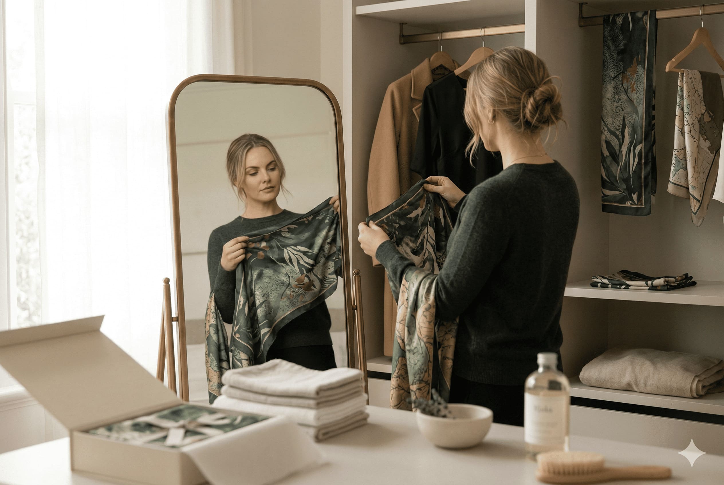 Our silk scarves are printed on pure silk - fabrics with a real weave, a real weight, and a finish you can feel immediately. Not chiffon that snags on a zip. Not polyester passed off as silk. The real thing.